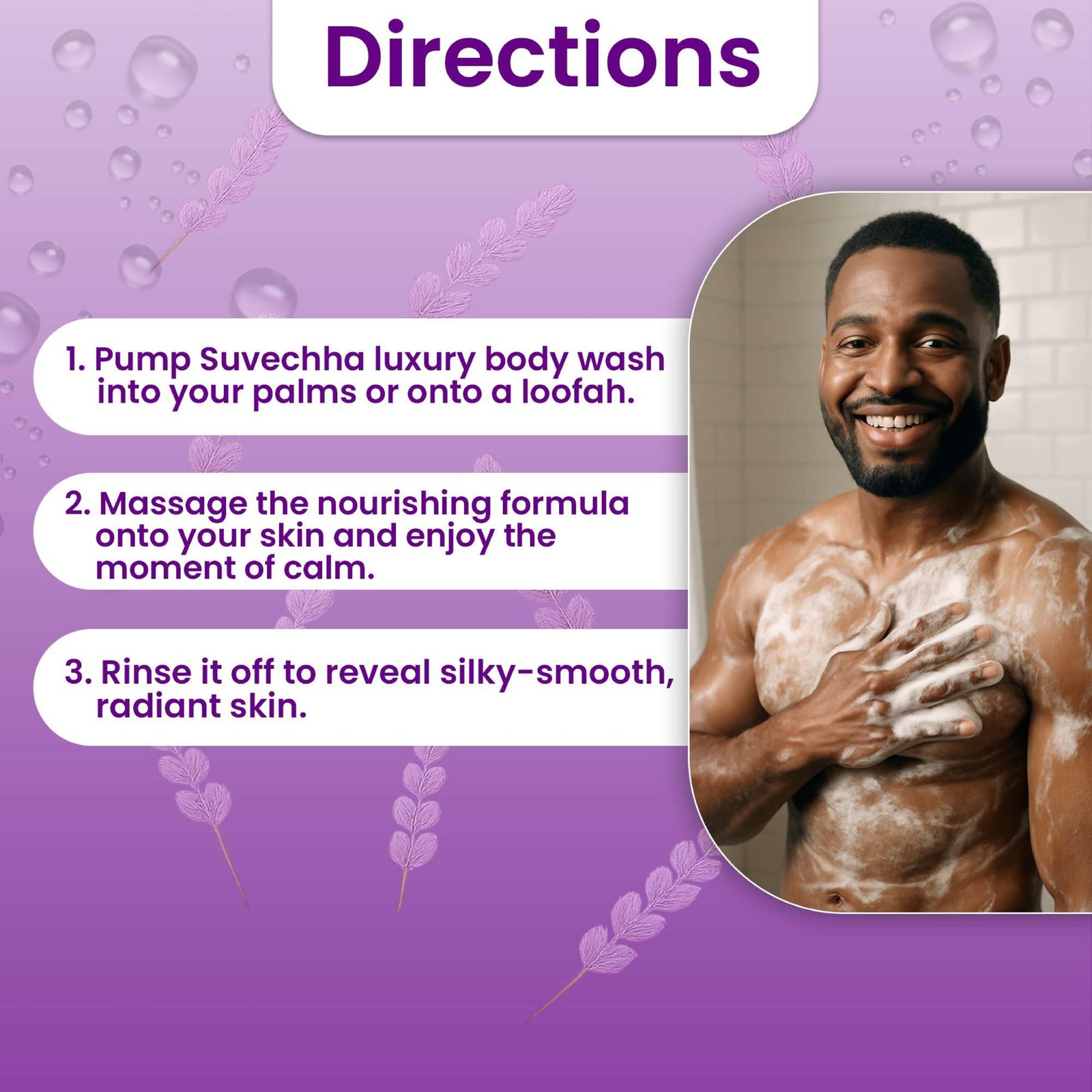 Ingredients: Organic Saponified Oils (Coconut, Olive, & Jojoba), Vegetable Glycerin, Organic Guar Gum, Organic Shea Butter, Lavandin Essential Oil, Orange Essential Oil, Rosemary Extract, Cedarwood Essential Oil, Organic Aloe VeraHow to use- Pump Suvechha luxury body was into your palms or onto a loofah.